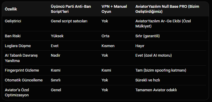 Null Base PRO, AviatorYazılım ekibi tarafından 2025 sonunda tamamlanan ve 2026’da tüm kullanıcılara sunulan özel bir anti-detection (tespit önleme) sistemidir. Piyasada “benzer” koruma iddiaları olsa da, Null Base PRO’nun tamamı bizim proprietary (özel mülkiyet) kod tabanımız üzerine kurulmuştur.